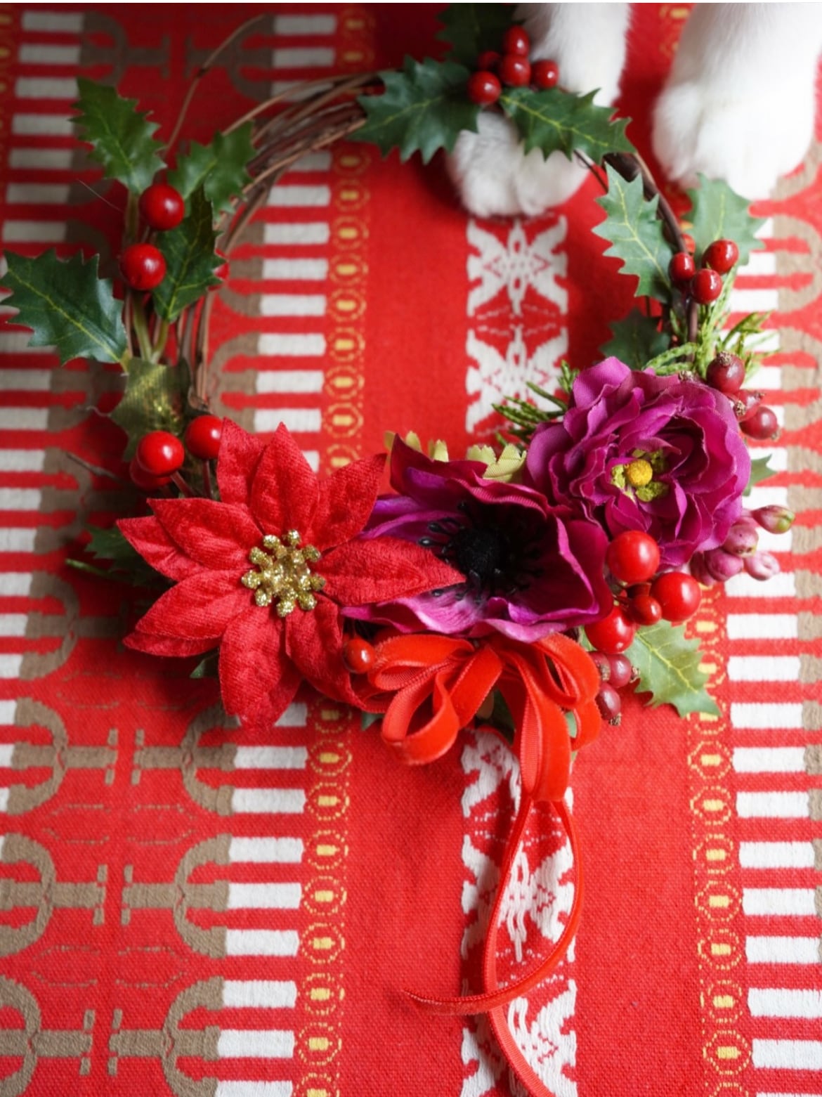アーティフィシャルフラワーのポインセチアや柊やクリスマスレッドなミニダリアやバラがついてるよ〜♪